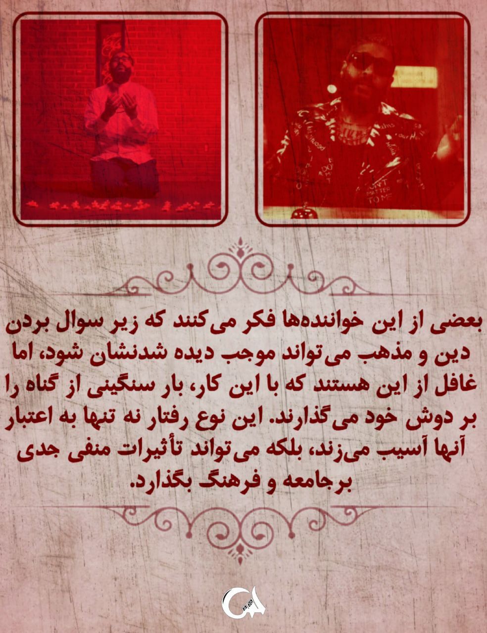 بعضی از این خواننده ها فکر میکنند که زیر سوال بردن دین و مذهب میتواند موجب دیده شدنشان شود اما غافل از این هستند که با این کار بار سنگینی از گناه را بر دوش خود میگذارند این نوع رفتار نه تنها به اعتبار آنها آسیب میزند بلکه میتواند تأثیرات منفی جدی بر جامعه و فرهنگ بگذارد.