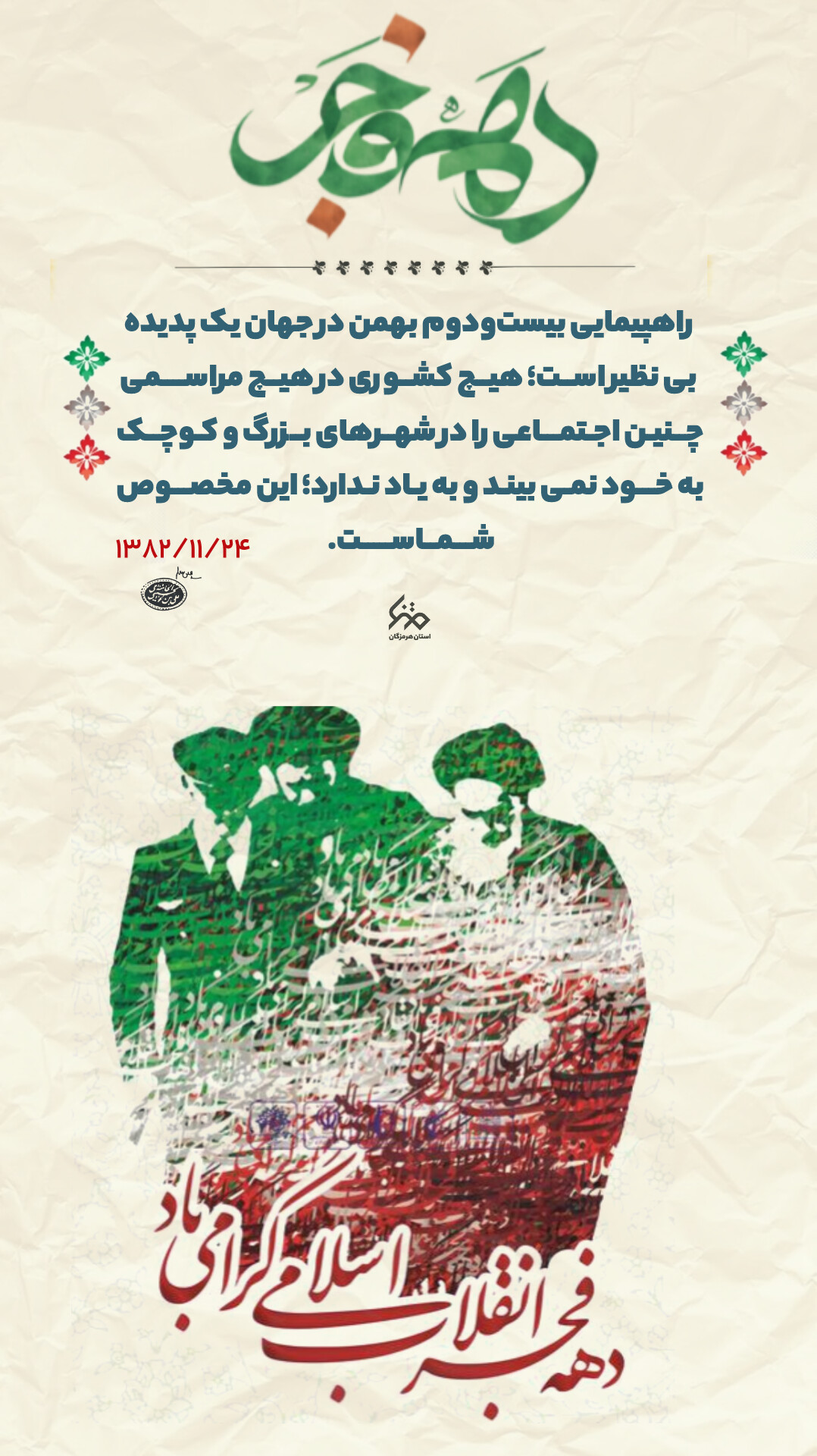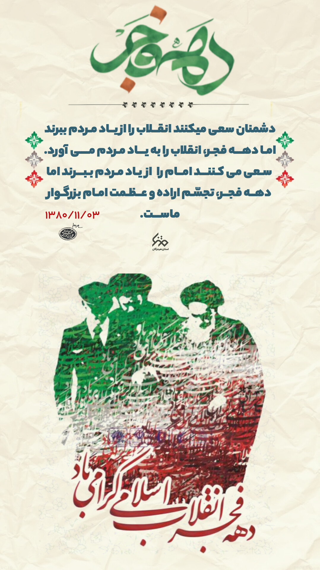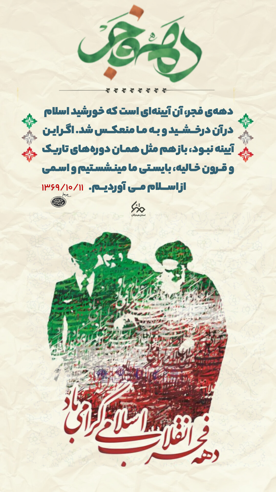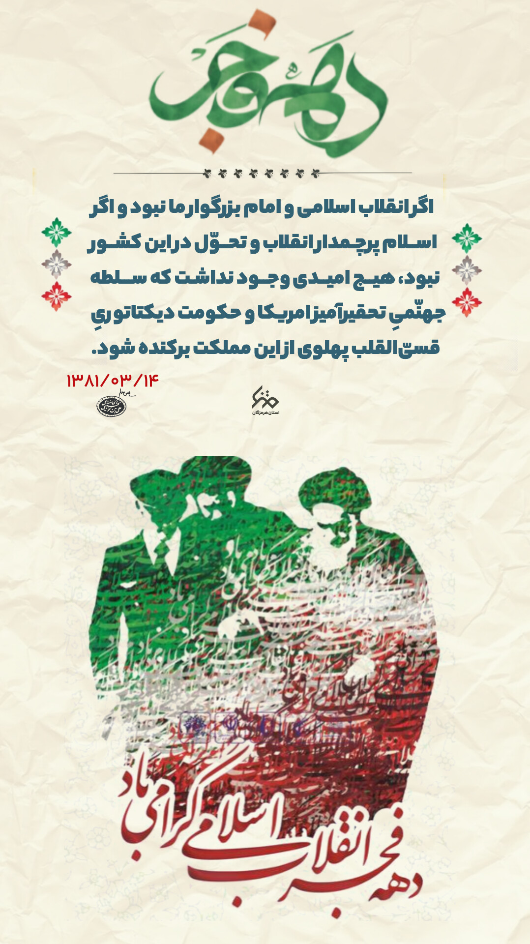 مجموعه پوستر| سخنان رهبر انقلاب درمورد اهمیت دهه فجر #مجموعه_پوستر کیش کیش, متنا کیش 1403/11/17 23 بهمن 1403 آیا این نوشته برایتان مفید بود؟ بلی 0 خیر 0 اشتراکگذاری پست برچسبها #اتقلاب_امید , #طلوع_فجر کیش
