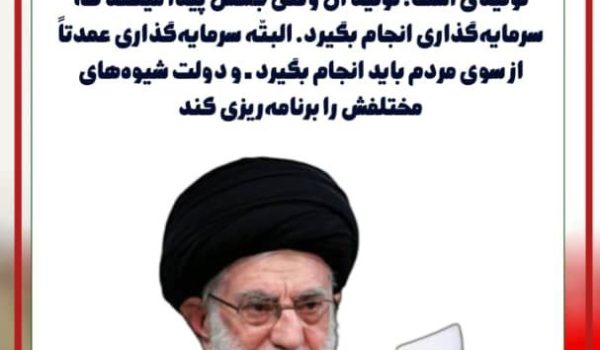 رهبر معظم انقلاب: شعار امسال «سرمایه برای گذاری تولید » است که این انشاء الله مایه گشایشی برای معیشت مردم خواهد شد و برنامه ریزی دولت با مشارکت مردم ،...