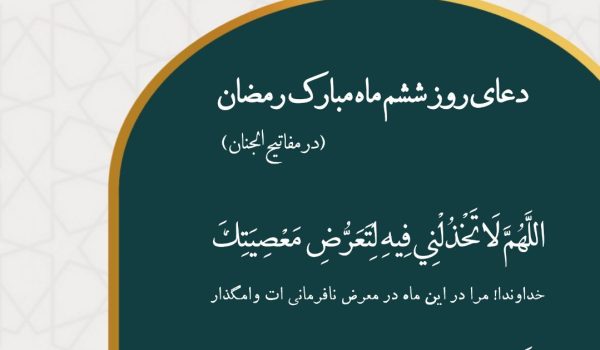 دعای روز ششم ماه مبارک رمضان (اللَّهُمَّ لاتَخْذُلْنِي فِيْهِ لِتَعَرُّضِ مَعْصِيَتِكَ، وَلا تَضْرِبْنِي بِسِياطِ نَقْمَتِكَ، وَزَحْزِحْنِيِ فِيْهِ مِنْ مُوجِباتِ سَخَطِكَ، بِمَنِّكَ وَأَيادِيكَ يا مُنْتَهى رَغْبَةِ الرَّاغِبِينَ.) «خدایا در این ماه...